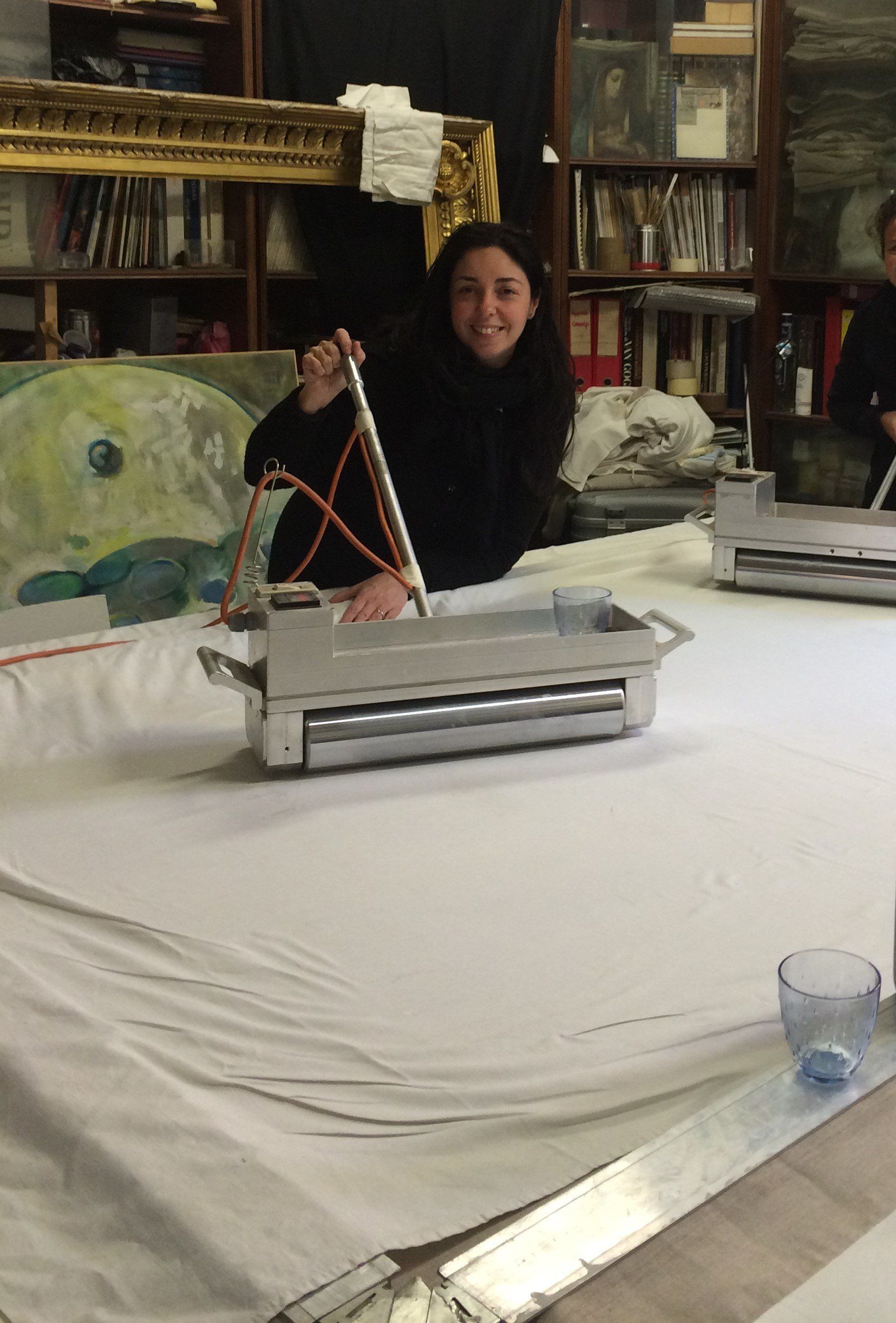 Consolidamento della tela e degli strati pittorici con applicazione di adesivi termoplastici e riattivazione con apporto di calore controllato e sottovuoto
